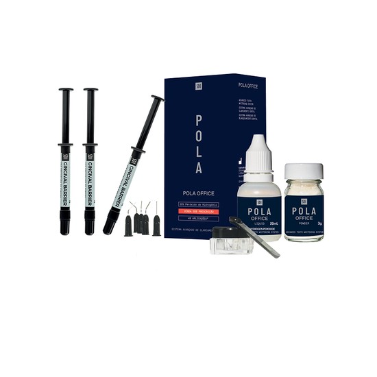 Peróxido de Hidrogênio 35%. Kit com 3g de pó + 20ml de Pola Office + 3 unidades de Barreira Gengival, 1g cada + Acessórios.